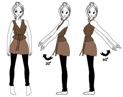 7. แกว่งแขนไปข้างหน้าเบาหน่อย ทำมุม 30 องศากับลำตัว แล้วแกว่งไปหลังแรงหน่อย ทำมุม 60 องศากับลำตัว จะทำให้เกิดแรงเหวี่ยง นับเป็น 1 ครั้ง โดยปล่อยน้ำหนักมือให้เหมือนลูกตุ้ม แกว่งแขนไป-มา โดยเริ่มจากทำวันละ 200-300 ครั้ง ค่อยๆ ขยับไป เป็นวันละ 500 ครั้ง จนถึงวันละ 1,000 สูงสุดวันละ 2,000 ครั้ง จะดีมาก ซึ่งจะใช้เวลาประมาณ 30 นาที